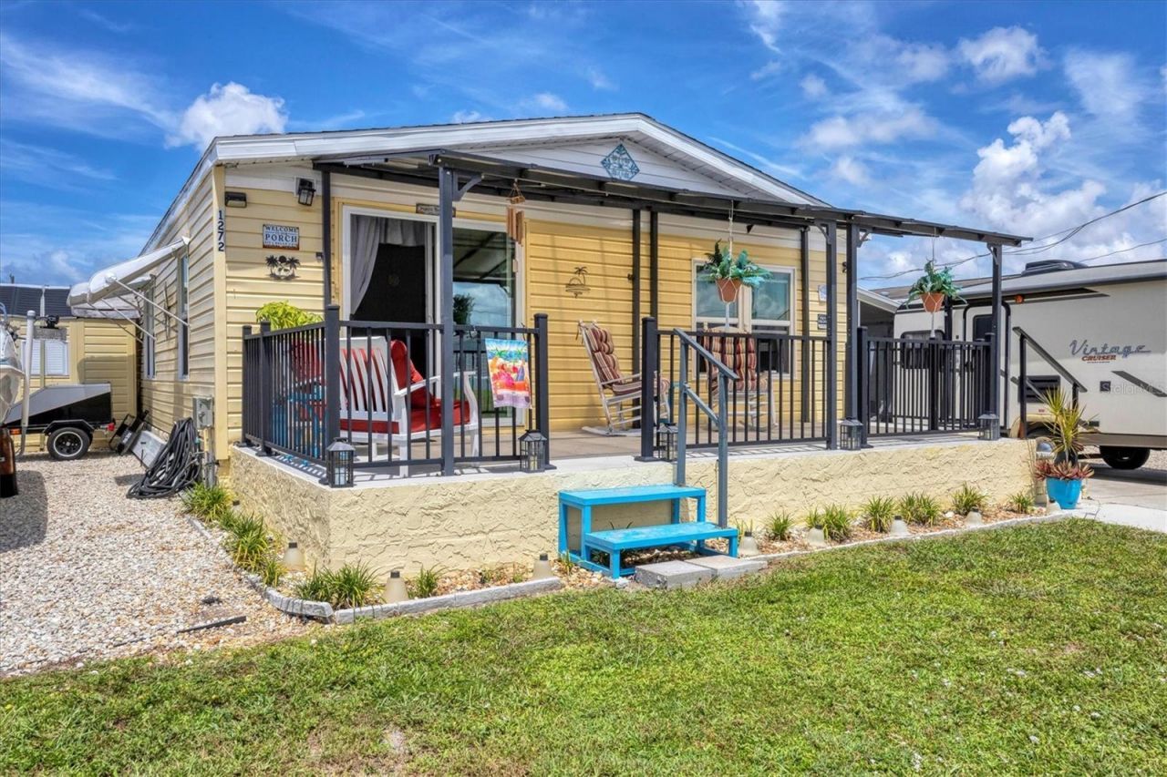 Waterfront living at its best! 55+ Community. This beautifully remodeled, spacious double-wide mobile home with soaring ceilings offers direct GULF access-only two bridges to the Intracoastal Waterway. Peace of mind comes with a 2022 roof, a new trunk line for the A/C, Icynene foam insulation, a new pressure valve, and all four corners of the home structurally braced. Enjoy 60 feet of waterfront with a 19x20 dock, perfect for your boat. The outdoor oasis is built for Florida fun, featuring a 10-foot-diameter above-ground pool, hot tub, his-and-her sheds, plus an additional shed with a washer and dryer. Entertain or unwind on the huge, screened back porch, relax on the welcoming front porch, or gather friends around the dry bar. Ample parking is available with a spacious main driveway and an extra driveway on the other side-ideal for your boat or trailer. You own the land-no lot rent-making this move-in-ready waterfront retreat the perfect place to call home! Close to beaches, shopping, and restaurants. Make your appointment to see this beauty today!