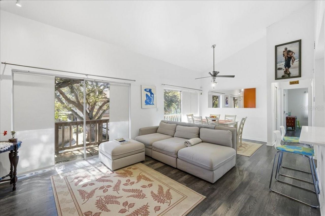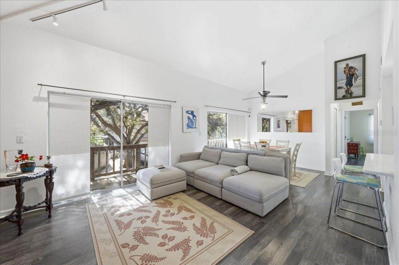 Updated 2-bedroom, 1.5-bath second-story condo with a 2-car garage, located in the park-like Eastwood Shores community. This inviting home showcases modern updates, natural light, and a well-designed layout suited for comfortable everyday living. Enter through the foyer into a bright and open living space where luxury vinyl plank flooring flows throughout the main living areas, kitchen, and bedrooms. The living and dining room combination is enhanced by vaulted ceilings and two sets of glass sliders out to the balcony, filling the space with natural light. Light-filtering roller shades soften the light while adding ambiance and privacy. The updated kitchen is open and modern, featuring white appliances including an LG refrigerator, shaker-style cabinetry with soft-close drawers and doors, contemporary hardware, and quartz countertops. The breakfast bar overhang offers an ideal spot for morning coffee, casual meals, or staying connected with guests in the living area. Both bedrooms offer large walk-in closets, while the primary bedroom boasts sliding glass door access to the balcony, creating a pleasant extension of the living space. The updated main bathroom features a tub/shower combination with multiple shower heads, oversized subway tile extending across the walls, a corner vanity, and recessed lighting for a clean, refreshed look. The balcony runs the width of the condo, with access from the living room, dining area, and primary bedroom, offering a comfortable setting for morning coffee, grilling, or unwinding at the end of the day. Additional features include a half-bath, full-size stacked washer and dryer in the in-unit laundry closet, attic storage, and a monthly fee that includes roof and exterior maintenance, water, trash, cable, and pest control. Eastwood Shores is a pet-friendly, maintenance-free community offering pools, a tennis court, and a fishing dock/pier on Old Tampa Bay. Centrally located with easy access to shopping, dining, healthcare, entertainment, St. Pete/Clearwater International Airport, Tampa International Airport, and just minutes from the area's best sandy beaches. Schedule your private tour today.