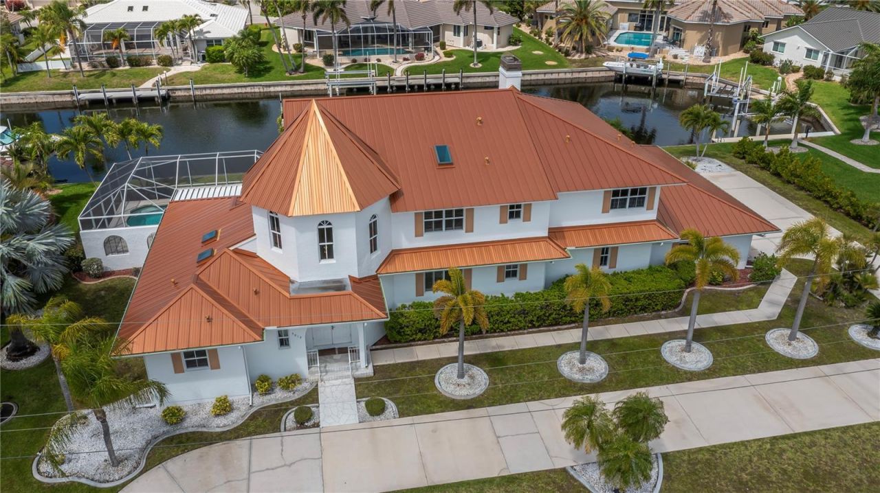 This stunning Mediterranean-style executive estate sits on two premium waterfront lots offering 160 feet of sailboat-access canal frontage - the ultimate setting for the serious boater or coastal lifestyle enthusiast. Located in the sought-after Punta Gorda Isles community, this one-of-a-kind home delivers the perfect blend of Old World elegance and modern Florida waterfront living. Enter through an impressive tower entrance that sets the tone for everything that follows. A beautifully crafted solid oak staircase greets you upon arrival. The heart of the home is a soaring great room with its dramatic ceiling height, walls of windows flooding the space with natural light, and rich oak paneling adding warmth and sophistication. The main sitting area anchors around a classic fireplace - ideal for Florida's cooler evenings - while the open layout accommodates multiple conversation areas perfect for entertaining on any scale. Gleaming 24-inch tile flows throughout the living areas on the main floor, and a wraparound second-floor balcony overlooks the entire space from above. The well-appointed kitchen features 42-inch cabinetry, Corian countertops, stainless steel double refrigerator/freezer, a center island with cook top, built-in desk, and casual dining area. Every inch has been designed for the home chef who loves to entertain. The adjacent formal dining room is bathed in natural light, framed by handsome wood beam ceilings, and overlooks the pool and waterfront. Built-in corner cabinetry throughout provides generous storage without sacrificing style. The expansive master suite is a private sanctuary. A newly installed private elevator connects the master level directly to the upstairs den, adding a sophisticated convenience rarely found in residential properties. The recently updated master bath showcases white wood cabinetry, dual sinks, a deep soaking tub, and a generous walk-in shower. A large walk-in closet and a separate walk-in linen closet ensure that storage is never a concern. An adjoining air-conditioned flex room - ideal as a home gym, workshop, or creative studio - includes a half bath. A second bedroom on the main floor near the entry features a custom built-in bed and walk-in closet, served by a beautifully updated bath with wood cabinetry, marble countertops, and a walk-in shower. Upstairs, a third bedroom offers access to a large cedar-lined closet as well as a full bath featuring a tub, tile floors, and quartz countertops. At the end of the upper hallway, a handsome oak-paneled den with fireplace provides a quiet retreat. Rounding out the upper level is a delightful English-style pub complete with built-in bar seating and custom woodwork - great for entertaining and a truly unique feature that sets this property apart from anything else in the area. The screened lanai features a sparkling pool and spa alongside a gallery-style covered passage along the exterior of the great room - an elegant transition between indoors and the waterfront. The double-lot configuration and generous seawall provide ample space to dock the boat of your choice with direct sailboat access to Charlotte Harbor and the Gulf of Mexico beyond. Whether you're a day sailor, offshore angler, or simply love waking up to waterfront views, this property delivers the quintessential Florida boating lifestyle. See this property today! You won't be disappointed!