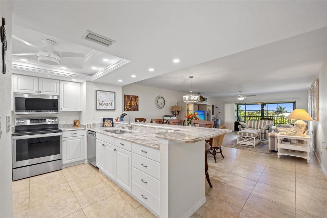GREAT LOCATION! TURN KEY TOP FLOOR UPDATED 2 BEDROOM, 2 BATH CONDO IN THE WATERFRONT COMMUNITY OF BANYAN POINT! Inviting open floor plan features over 1,398 square feet of living area, neutral d?cor and tile flooring throughout. The kitchen has white cabinetry, granite countertops and a large breakfast bar perfect for entertaining. The living room is bright and spacious and opens up with sliding doors to the screened lanai. Generous primary bedroom features a slider with access to lanai, walk-in closet and private ensuite featuring dual sinks and walk-in shower. Split floor plan provides guests with plenty of privacy for guest bedroom with full guest bath. Screened lanai features versatile vinyl windows to enjoy year-round rain or shine. Unit is conveniently located close to elevator. Docks in Banyan Point are on a first come- first serve basis, however several are currently available for a minimal yearly fee of $387 Docks are 50 feet. Banyan Point Community amenities include a year-round community pool that is heated in the winter and chilled in the summer. Also noteworthy, Banyan Point is located in Punta Gorda Isles and owners qualify for PGICA, which is the Punta Gorda Isles Civic Association, offering over 30 special interest clubs and multiple classes, meetings, club gatherings, and entertainment membership (for a fee), along with being close to downtown and walking distance to Fishermen's Village and gorgeous parks and walking trails. Banyan Point is an extremely friendly community with monthly pot-luck dinners. Don't miss this opportunity! Schedule your private showing today!